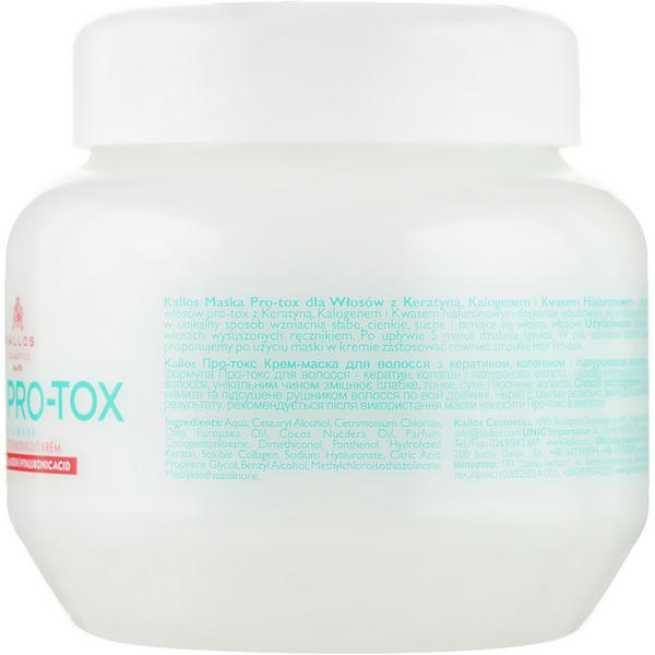 Волосы нуждаются в очень тщательном и бережном уходе, ведь ежедневно они подвергаются различным «атакам» фена, утюжка, щипцов, различных стайлинговых средств, не говоря уже о палящих солнечных лучах или сильном морозе. Именно поэтому использование только шампуня и бальзама недостаточно для полного восстановления и реанимирования волос. Чтобы действительно увидеть впечатляющий результат и придать волосам жизни и красоты, стоит обзавестись великолепной маской Hair Pro-Tox Mask от известного венгерского производителя Kallos Cosmetics.
