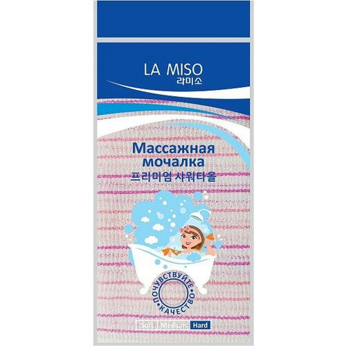 Массажная мочалка LaMiso хорошо устраняет загрязнения, очищает поры. Способствует нормализации кровообращения, повышает тонус и эластичность кожи. Образует большое количество пены. Размер: 30х90 см.