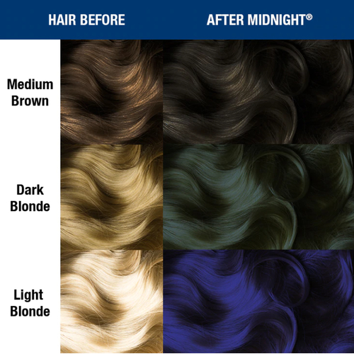 After Midnight — когда здоровый вид волос и яркий цвет слились в одно целое и явили на этот свет тёмно-синий оттенок, сумеречного неба! Густой синий цвет, хорошо закрасит следы, оставшиеся от прошлого окрашивания. А если смешать его с Ultra Violet, то Вы получите уникальный черничный цвет волос. Классическая формула Manic Panic давно полюбилась всем, кто любит яркое окрашивание! Кремовая текстура нежно ложится на волосы, что делает её невероятно удобной в домашних условиях.