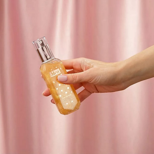 Мист для тела, искрящийся, как пузырьки шампанского на свету.