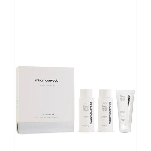 Линия GLACIAL WHITE CAVIAR – секрет безупречного увлажнения. Уникальная линия с маслом прозрачно-белой икры обеспечивает длительное увлажнение кожи головы и волос (24 часа), защищает от агрессивного воздействия высоких температур, дарит мгновенное ощущение свежести сразу после нанесения, успокаивает сухую и раздраженную кожу головы. Средства не содержат парабенов, сульфатов, фосфатов, минерального масла, фталатов, парафина, вазелина. Рекомендуются для восстановления сухих, мелированных и поврежденных волос. Набор состоит из: Hydra Pure Shampoo / Увлажняющий шампунь с маслом прозрачно-белой икры 100 мл Hydra Pure Shampoo – Обладая увлажняющими и омолаживающими свойствами, шампунь идеально подходит для тонких тусклых, лишенных блеска, поврежденных волос (после процедур окрашивания и/или выпрямления, воздействия высоких температур, инсоляции). Помогает сбалансировать микрофлору кожи головы, устранить дискомфорт благодаря мягкой, нераздражающей кожу формуле. Hydra Pure Rescue Masque / Увлажняющая восстанавливающая маска 100 мл _Hydra Pure Rescue Masque – Эксклюзивное увлажняющее и омолаживающее действие активных ингредиентов позволяет практически моментально восстановить поврежденные, сухие волосы и гидролипидный баланс кожи головы. Маска способствует устранению зуда и шелушения кожи, выравнивает структуру волоса, придавая им блеск, облегчая расчесывание и укладку. Идеально подходит для волос, поврежденных окрашиванием или кератиновым выпрямлением. Hydra Pure Timeless Beauty Cream / Увлажняющий крем для поддержания красоты 50 мл Hydra Pure Timeless Beauty Cream – Крем восстанавливает и подчеркивает природную красоту волос, придавая им сияние и блеск, благодаря пудре из драгоценных камней. Облегчает расчесывание, укладку, мгновенно увлажняет, предупреждает ломкость волос и защищает их от преждевременного старения. Идеально подходит для волос, поврежденных окрашиванием или кератиновым выпрямлением.