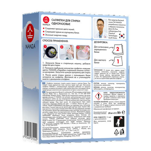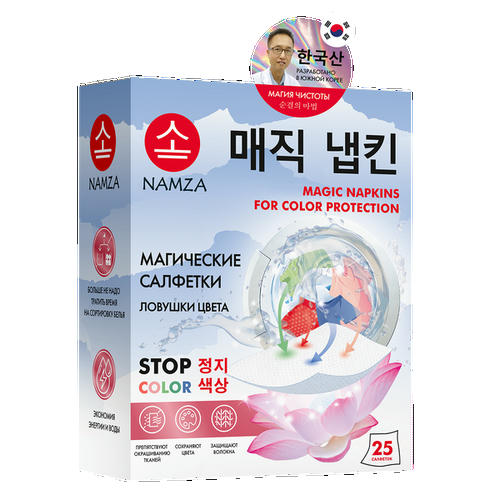 Способ применения: 1. Загрузите белье в стиральную машину, добавьте средство для стирки. 2. Положите требуемое количество салфеток ловушек цвета NAMZA в барабан стиральной машины согласно дозировке. Запустите нужную программу для стирки. 3. После цикла стирки краска с полинявшего белья останется на салфетке. Достаньте ее и утилизируйте вместе с домашними отходами