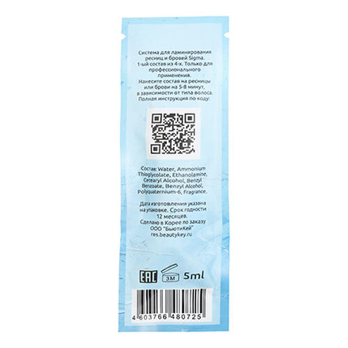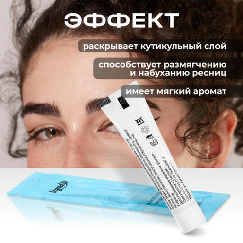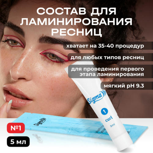 Первый состав для ламинирования ресниц Sigma Curl раскрывает кутикульный слой, способствует размягчению и набуханию ресницы. На этом этапе закладывается будущая форма и изгиб. Препарат содержит полимер, который создает на волосках защитную пленку и защищает во время первой экспозиции. Ресница сохраняет свою массу, уровень увлажненности и здоровье. Средство имеет мягкий pH 9.3, с ним можно работать на любых типах ресниц без повреждения и сухости. Кремообразная консистенция распределяется равномерно и однородно, окутывает каждый волосок. Средство имеет мягкий аромат.Препарат представлен в специальной полимерно-алюминиевой тубе, которая сохраняет герметичность и стерильность средств, не пропускает воздух, влагу, свет. Упаковка органически упругая, не засасывает воздух при извлечении состава. Благодаря пластичности тубы продукты легко дозировать и использовать до последней капли. Объем средства 5 мл, хватает на 35-40 процедур.