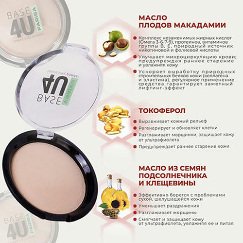 Пудра Base 4U – это лёгкое и шелковистое средство для матового и естественного покрытия кожи лица. Пудра имеет гипоаллергенную формулу, поэтому подходит даже для людей с чувствительной кожей, прекрасно скрывает недостатки и придает вашей коже бархатистый и светящийся вид. Особая технология запекания состава обещает максимальную укрывистость и стойкость макияжа, с этой пудрой вам совершенно не страшны перепады погоды.