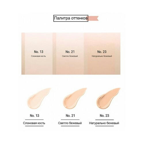 Кушон обладает мягкой и нежной текстурой. Не забивает поры. Подходит для любого типа кожи. Скрывает покраснения, несовершенства и пигментные пятна, выравнивает тон. Обеспечивает защиту от УФ лучей SPF50+ PA++++, предотвращая фотостарение кожи. Применение: Наносите на очищенную кожу при помощи спонжа похлопывающими движениями.