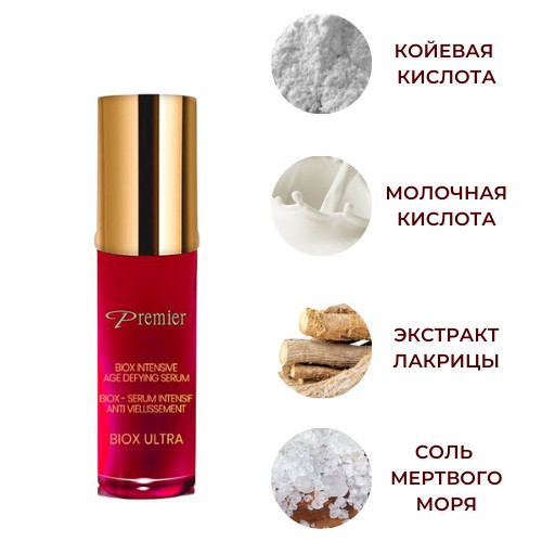 Сыворотка дает незамедлительный эффект лифтинга и омоложения. Благодаря койевой и молочной кислоте тон лица становится ровным, текстура выравнивается, кожа светится изнутри и выглядит моложе. Экстракт лакрицы стимулирует синтез собственного коллагена и эластина, делая кожу более плотной и упругой, укрепляет стенки сосудов и обладает осветляющим эффектом. Экстракты водной настурции и овса, глицерин и соль Мертвого моря поддерживают оптимальный уровень увлажнённости кожи, защищая ее от обезвоживания и преждевременного старения. Витамин Е обеспечивает мощную антиоксидантную защиту, нейтрализуя свободные радикалы, помогает коже бороться с негативным воздействием окружающей среды,
