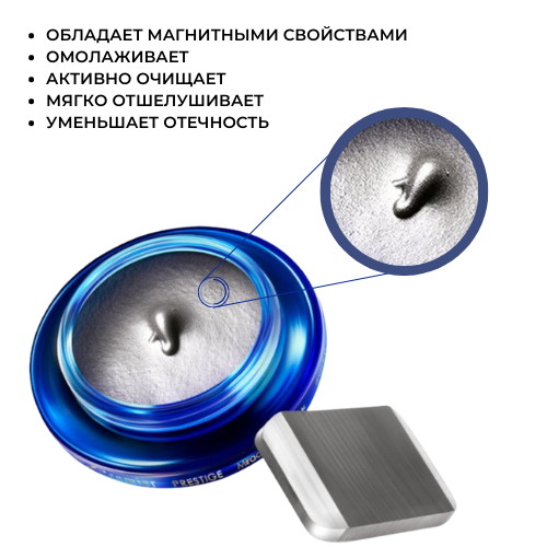 Маска оказывает на кожу активное очищающее и мягкое отшелушивающее действие. Улучшает кровообращение, уменьшает отечность, восстанавливает упругость и эластичность увядающей кожи. Магнитные свойства маски обусловлены наличием нежнейшей железной пудры.