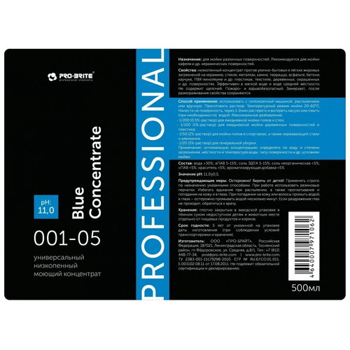 Жидкий концентрат против улично-бытовых загрязнений на керамической плитке, стёклах, металлах, камне, тераццо, каучуке, ПВХ-линолеуме и др. пластиках, окрашенных и др. поверхностя. Эффективен при разбавлении мягкой водой или водой средней жёсткости (0-8°Ж).