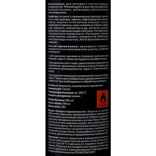 Растворяет клеевую основу этикеток, наклеек, стикеров и пр. Имеет выраженный запах растворителя!