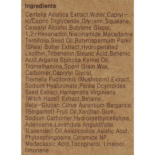 Centella Asiatica Extract (50%, strengthens skin-barrier), Water, Caprylic/Capric Triglyceride (skin-conditioning agents), Glycerin (humectants), Squalane (occlusive), Cetearyl Alcohol (emulsion stabilizers), Butylene Glycol (humectants), 1,2-Hexanediol (stabilizers), Niacinamide (brightening), Macadamia Ternifolia Seed Oil (occlusive), Butyrospermum Parkii (Shea) Butter Extract (skin-conditioning agents), Hydrogenated Lecithin (emulsifying agents), Tribehenin (occlusive), Stearic Acid (emulsifying agents), Behenic Acid (emulsifying agents), Argania Spinosa Kernel Oil (emollient), Tromethamine (pH adjusters), Spent Grain Wax (skin-conditioning agent), Carbomer (viscosity increasing agents), Caprylyl Glycol (emollient), Tremella Fuciformis (Mushroom) Extract (skin-conditioning agents), Sodium Hyaluronate (natural moisturizing factor/ humectants), Perilla Ocymoides Seed Extract (skin-conditioning agent), Hamamelis Virginiana (Witch Hazel) Extract (skin-conditioning agents), Betaine (humectants), Beta-Glucan (skin conditioning agents), Citrus Aurantium Bergamia (Bergamot) Fruit Oil (skin conditioning agent), Xanthan Gum (viscosity increasing agents), Sodium Carbomer (viscosity increasing agents), Hydroxyethylcellulose (viscosity increasing agents), Adenosine (strengthens skin barrier), Asiaticoside (strengthens skin barrier) , Asiatic Acid (strengthens skin barrier), Phytosphingosine (Skin-conditioning agent), Ceramide NP (strengthens skin barrier), Madecassic Acid (strengthens skin barrier), Tocopherol (Antioxidant)