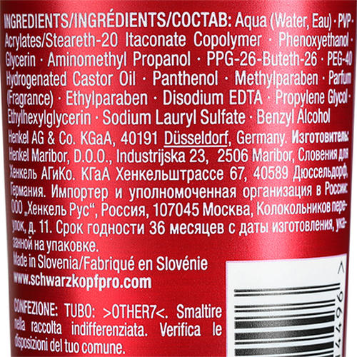 Состав: Aqua (Water, Eau), Pvp, Acrylates/Stareth-20 Ltaconate Copolymer, Phenoxyethanol, Glycerin, Aninomethyl Propanol, PPG-26-Buteth-26, PEG-40 Hydro Genated Castor Oil, Panthenol, Methylparaben, Parfum (Fragrance), Ethylparaben, Disodium EDTA, Propylene Glycol, Etnyhexyglycerin, Sodium Lauryl Sulfate, Benzyl Alcohol.