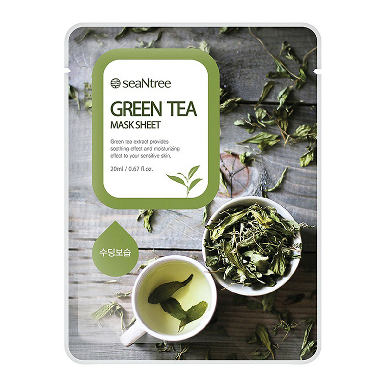 SEANTREE GREEN TEA MASK SHEET (20ml*10ea) – маска интенсивно увлажняет кожу лица, успокаивает и тонизирует её, устраняет покраснение и шелушение, обладает противовоспалительными и антисептическими свойствами, омолаживает и смягчает кожу, разглаживает её и выравнивает тон, способствует выведению токсинов. Основными активными компонентами формулы продукта являются: экстракт зелёного чая и коллаген, которые возвращают коже упругость, эластичность и здоровый внешний вид.