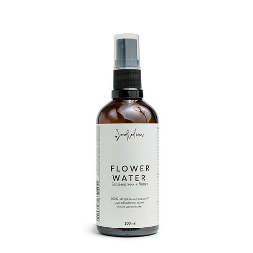 Гидролат для тела после депиляции Flower Water _ ухаживающий продукт из ассортимента натуральной ухаживающей косметики бренда SmoRodina, получаемый путем паровой дистилляции растений (бессмертник, лопух и пр.).