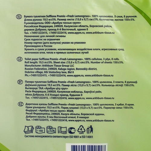 Soffione т/б Премиум Фреш Лемонграсс 3 слоя 8 рулонов