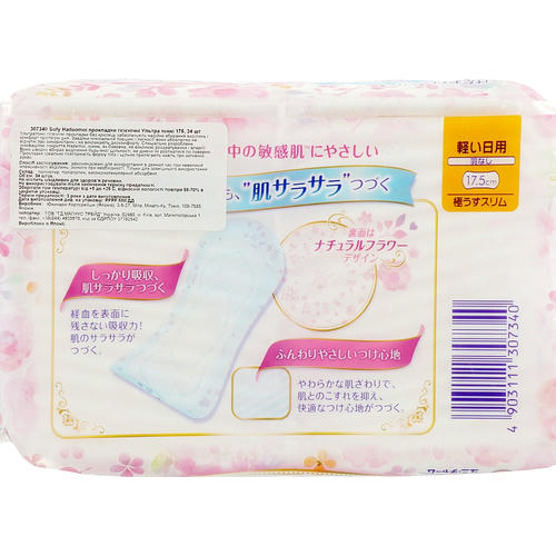 Прокладки от Unicharm в 2 раза тоньше обычных, поэтому совсем не доставляют неудобств. Средство рассчитано на применение при среднем уровне выделений и имеет забавный дизайн с сердечками. Мягкое покрытие прокладок нежно касается кожи, не вызывая раздражений.