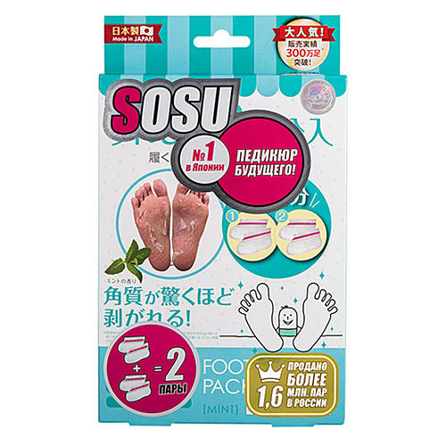 Носочки “Sosu” – это инновационный способ педикюра на дому без риска и траты времени на посещение дорогостоящих процедур. Применение: срежьте верхнюю часть пакета, достаньте носочки. Не разлейте жидкость, которая находится внутри носочков. Наденьте носочки и оставьте на 1-2 ч. в зависимости от состояния кожи стоп. Снимите носочки и помойте ноги в теплой воде. В течение 5-7 дней начнется отшелушивание верхних слоев кожи. Способ и время отшелушивания кожи могут меняться в зависимости от личных особенностей человека.
