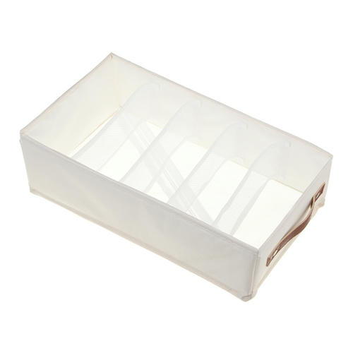 Удобный органайзер с 5 отделениями для хранения одежды и других небольших предметов. Органайзер выполнен из качественного, прочного и при этом дышащего материала. Усиленные боковые стенки не прогибаются и прекрасно держат форму, общее пространство разделено на 5 секций, что позволяет грамотно организовать пространство. Размер 33х16,5х10 см. Органайзер удобно располагается в шкафу, на полке или стеллаже. Теперь любая мелочь будет под рукой и в быстром доступе. Благодаря стильному дизайну короб красиво смотрится в интерьере комнаты.